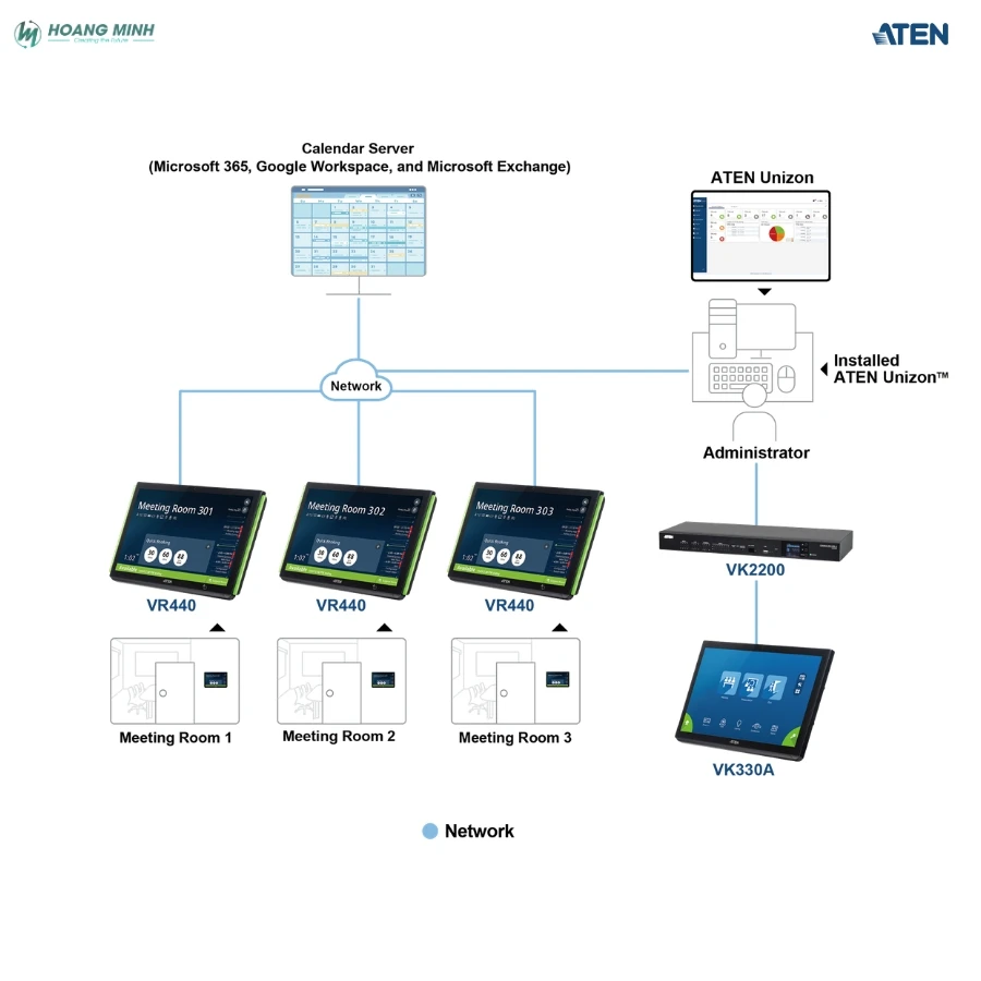 - Tích hợp hệ thống đặt phòng: Khi kết hợp với ATEN Unizon và ATEN Room Booking, ATEN VK330A cho phép người dùng đặt phòng trực tiếp trên màn hình, thực hiện check-in/check-out nhanh chóng và theo dõi trạng thái phòng theo thời gian thực. Điều này giúp tối ưu hóa việc sử dụng phòng họp và nâng cao trải nghiệm người dùng.